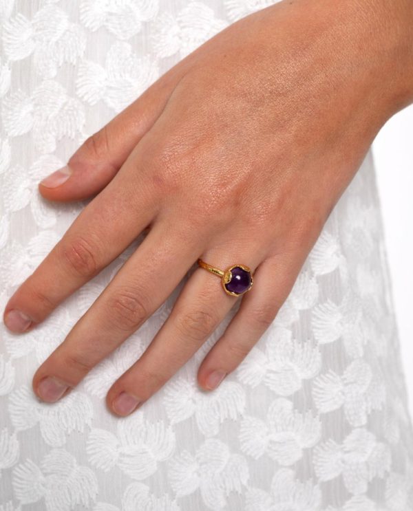 Un anillo fino con un estilo romántico muy original! Este anillo bañado en Oro de 18kt con una piedra redonda amatista natural en tono morado va a conquistar todos tus looks. Prueba a llevarlo con otros anillos finos dorados. La piedra al ser natural puede variar de tonalidad.