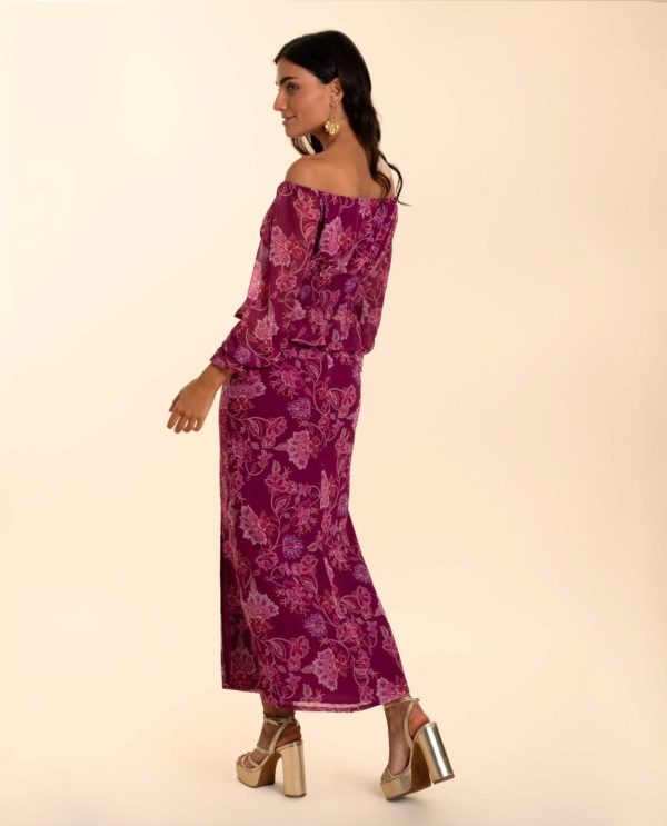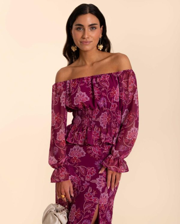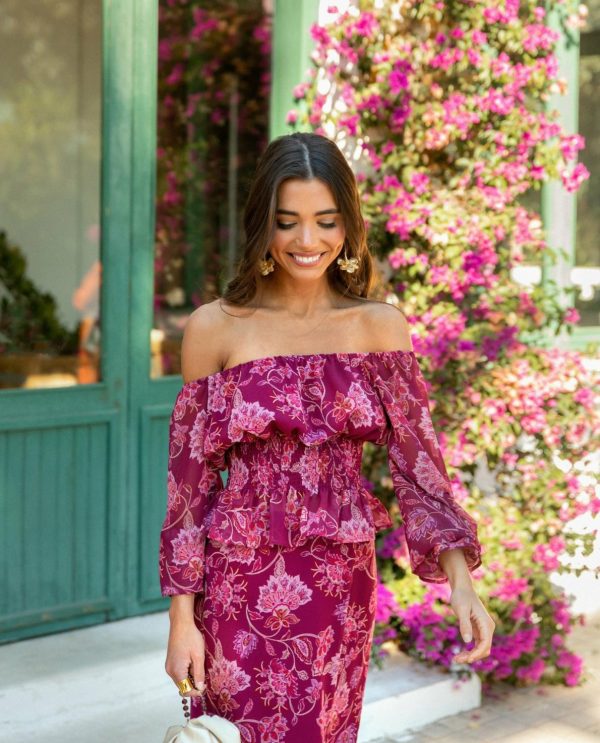 El conjunto Carmona refleja elegancia con un estampado de flores en tonos rosas diseñado 100% por nuestro equipo. La blusa queda fruncida en la cintura con un efecto nido de abeja para marcar la silueta y el escote bardot puedes llevarlo con los hombros al descubierto o tapados. Las mangas transparentes con el detalle del puño aportan el toque romántico. La falda midi sienta como un guante, con abertura delantera y cremallera invisible para un ajuste perfecto.
