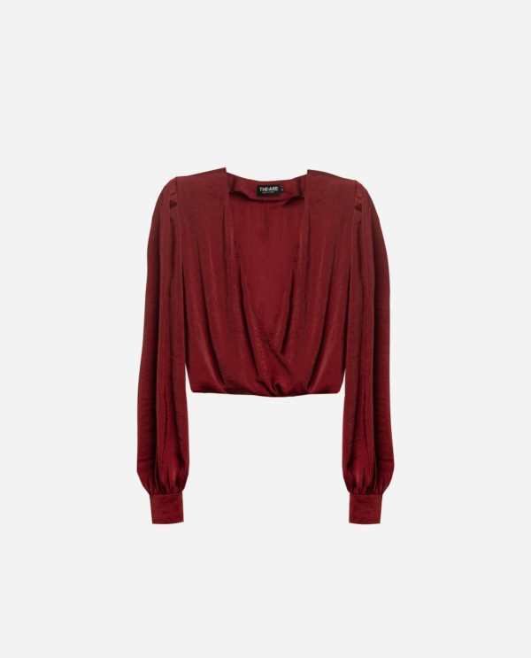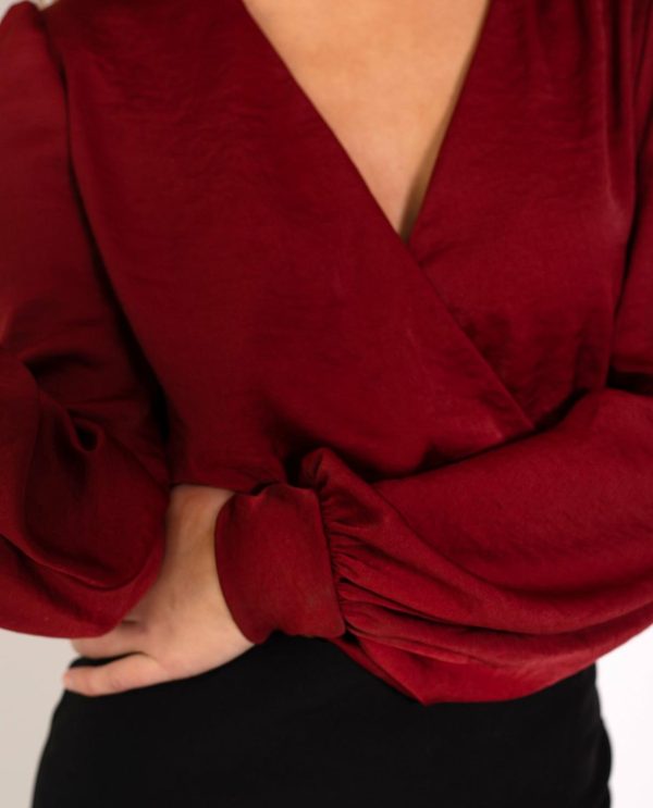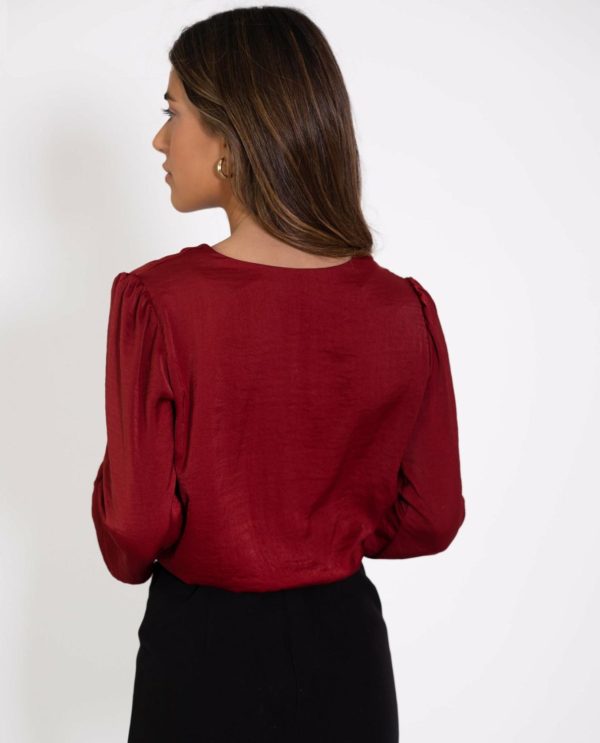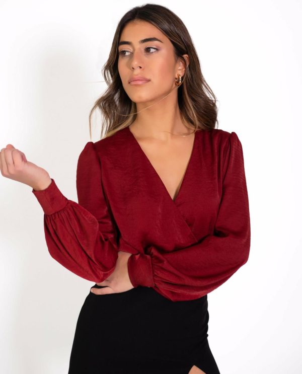 Esta blusa nos encanta por su patrón elegante y por su color burdeos satinado que no puede ser más acertado para llevar en momentos especiales. Es una blusa elegante con escote cruzado que la hemos diseñado con un efecto ablusado muy favorecedor y las mangas largas fruncidas con puños. Es un diseño único que incluir ya a tu colección, no te quedes sin ella!