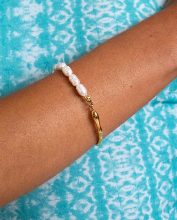 Una pulsera de perlas con una cadena irregular de acero inoxidable bañada en Oro de 18kt. Una pulsera o brazalete elegante a la vez que versátil gracias a su diseño multiposición. Se convertirá en tu próximo básico para llevar a todas partes!