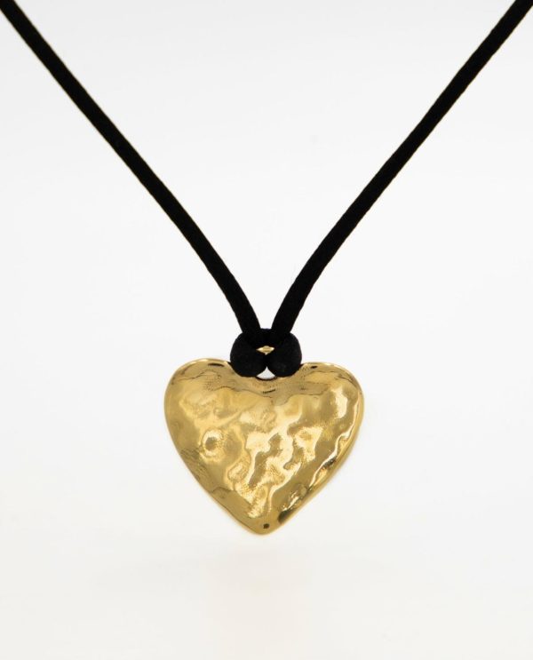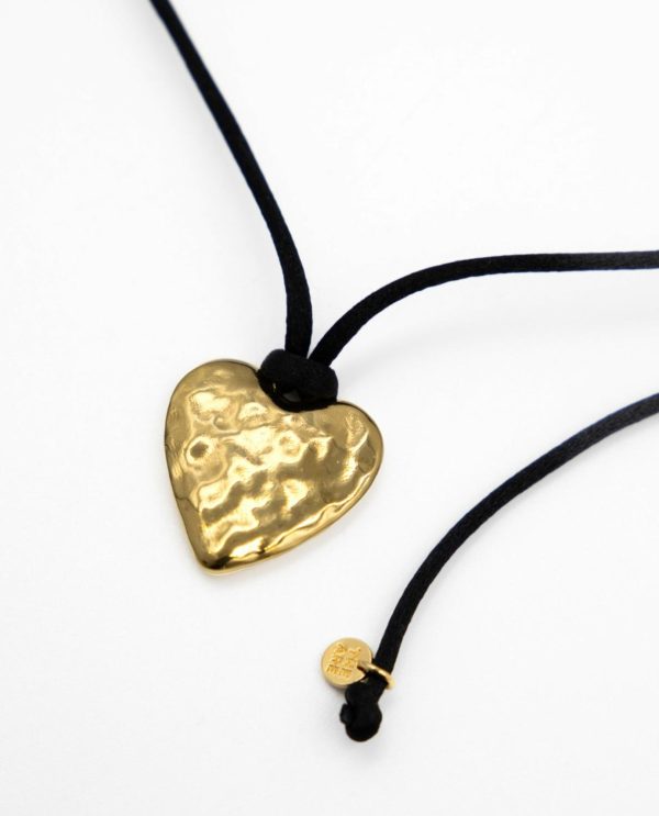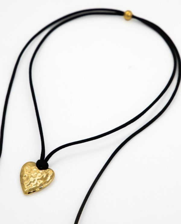 Un collar súper versátil que podrás llevar de mil formas! Es uno de los accesorios más buscados de la temporada, una tendencia que combina con todos tus looks, tanto de día como de noche. El diseño es un cordón negro que puedes regular y el corazón bañado en oro de 18kt tiene una textura de marea, nos encanta!!❤️
