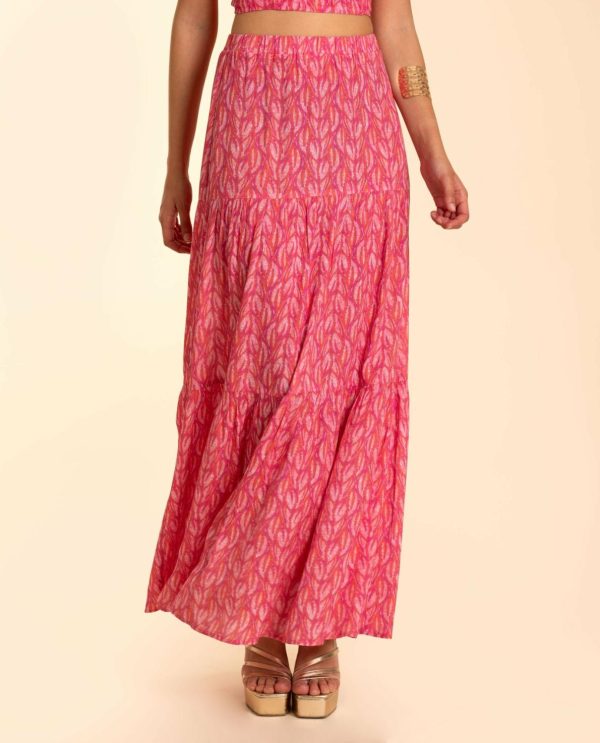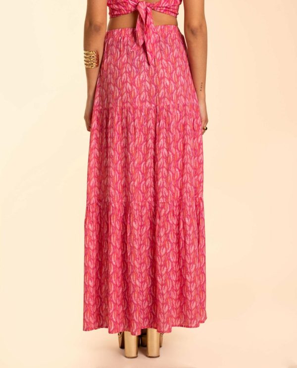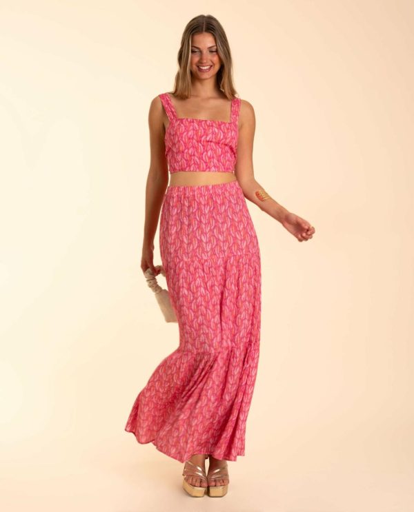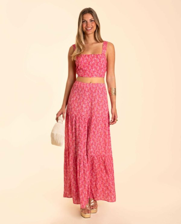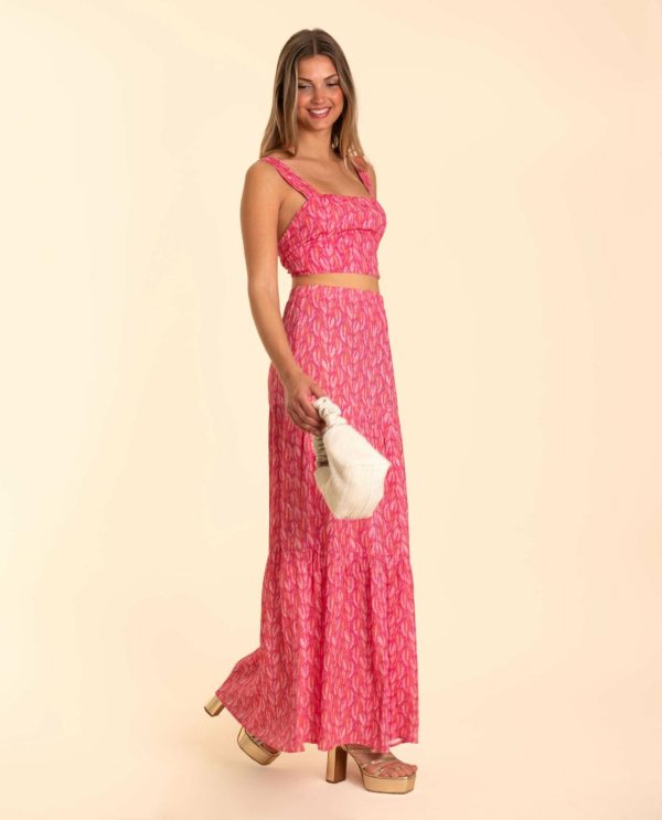 Este conjunto se convierte en una opción muy segura para ser la invitada ideal. Está confeccionado en un tejido muy especial con un estampado diseñado por nosotras y con el detalle de hilo de lurex con un poco de brillo. La combinación de colores no puede ser más favorecedora y esta temporada las maxi faldas son un must have. La hemos diseñado de tiro alto con la cinturilla elástica para mayor adaptabilidad y comodidad. Es una falda con mucha caída, lo que le da un movimiento precioso al caminar y, al ser larga, tiene ese efecto boho romántico que nos encanta! Es una falda elegante de invitada que podrás combinar de mil formas para cualquier ocasión especial. Elígela ahora y prueba a combinarla con la Blusa Camelia para conseguir el total look perfecto.
