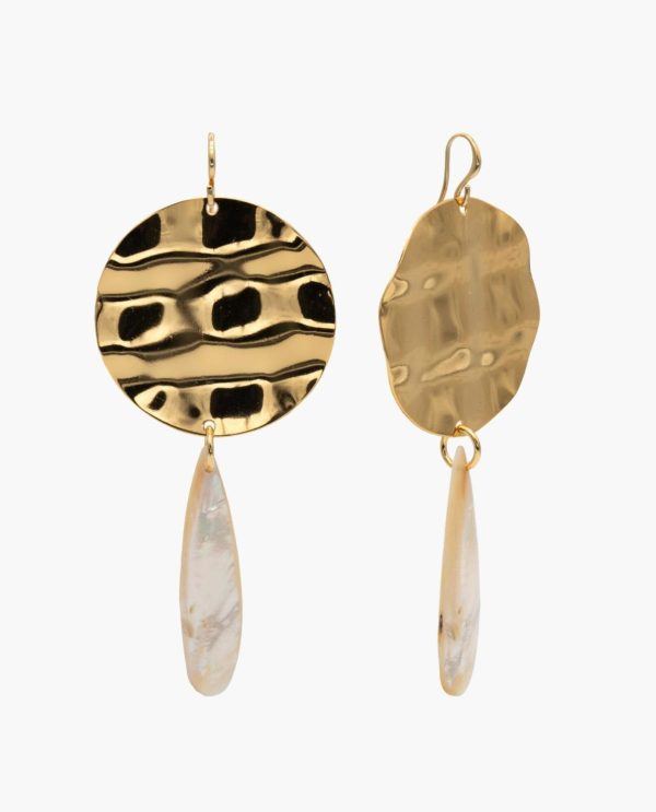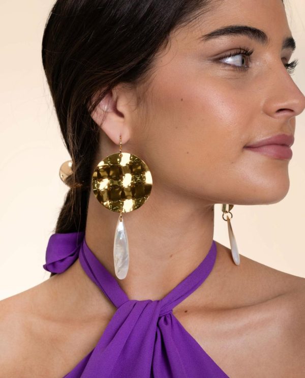 Estos pendientes no pueden ser más elegantes! Destacan por su medalla dorada con texturas de agua, reflejando un brillo precioso cuando le da la luz. Van acompañados de una piedra nácar natural con forma de gota, lo que aporta movimiento a los pendientes. Sin duda, uno de los pendientes más especiales y originales para llevar en tu próximo evento.