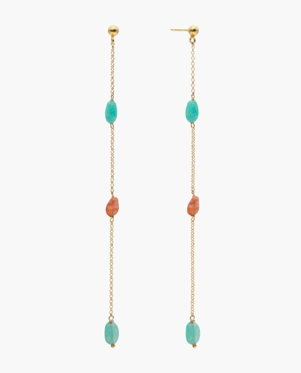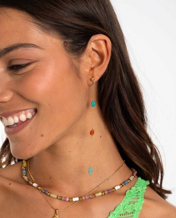 Una cascada de color para refrescar tus looks! Estos pendientes largos bañados en Oro de 18kt harán que tu look del verano sea el protagonista. Tienen mucho movimiento, compuesto por una cadena finada dorada y piedras naturales, por lo que el tamaño puede variar.