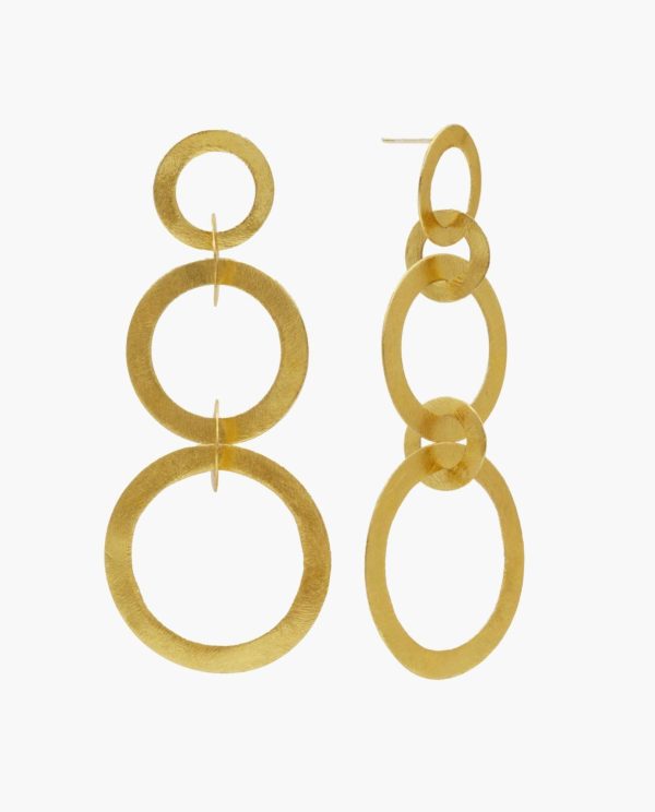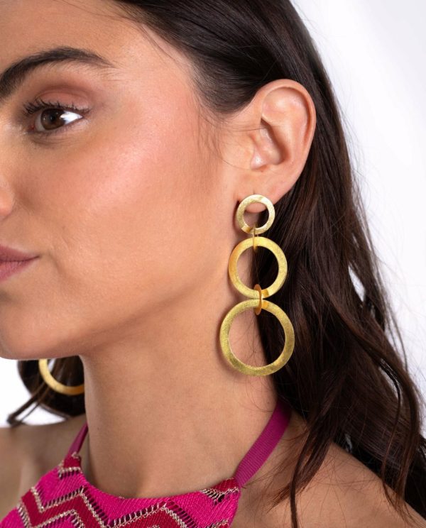 Son unos pendientes con un diseño sencillo, ideales para llevar a diario. Sus circulos entrelazados son de varios tamaños y por su diseño, con el movimiento reflejan la luz aportando brillo al rostro. Sientan genial!