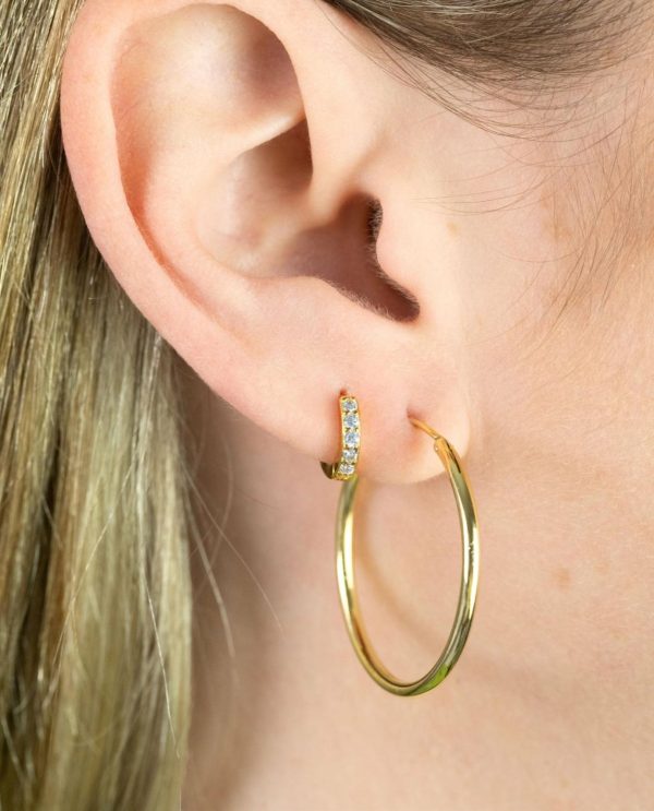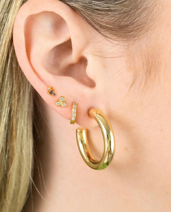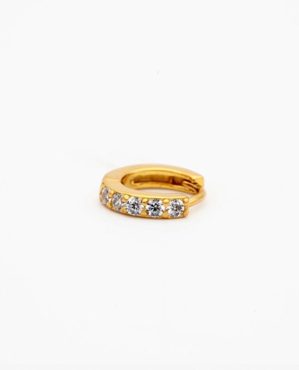 Un arito de tamaño pequeño lleno de pequeñas piedras brillantes y cierre de click. Hecho de Plata de Ley 925 y bañado en Oro de 18kt, este piercing de aro es ideal para combinar con otros pendientes plata. Un piercing perfecto para incluir en tu colección de básicos imprescindibles.