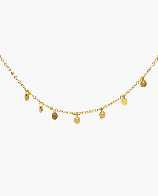 - Tobillera dorada con colgantes redondos y detalle de bolitas.