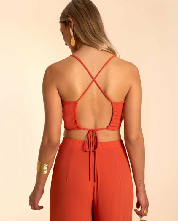 Este conjunto de top y pantalón es uno de esos looks de invitada que nada más te lo pruebes te sentirás espectacular con él. El cuerpo es ajustado estilo corsé, con pinzas delanteras para que entalle y siente genial. Los tirantes finos de este top se cruzan en la espalda, muy elegante y sofisticado, y lo mejor es que puedes ajustarlo a tu medida para que se adapte a tu silueta. Su color naranja terracota es simplemente perfecto. Si tienes una ocasión especial, evento o una fiesta, con este top corto vas a conseguir elevar cualquier look! Combínalo con el Pantalón Margarita para conseguir el match perfecto.