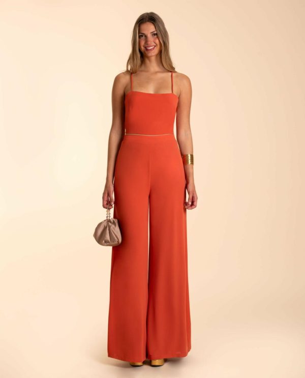 Este conjunto de top y pantalón es uno de esos looks de invitada que nada más te lo pruebes te sentirás espectacular con él. El cuerpo es ajustado estilo corsé, con pinzas delanteras para que entalle y siente genial. Los tirantes finos de este top se cruzan en la espalda, muy elegante y sofisticado, y lo mejor es que puedes ajustarlo a tu medida para que se adapte a tu silueta. Su color naranja terracota es simplemente perfecto. Si tienes una ocasión especial, evento o una fiesta, con este top corto vas a conseguir elevar cualquier look! Combínalo con el Pantalón Margarita para conseguir el match perfecto.