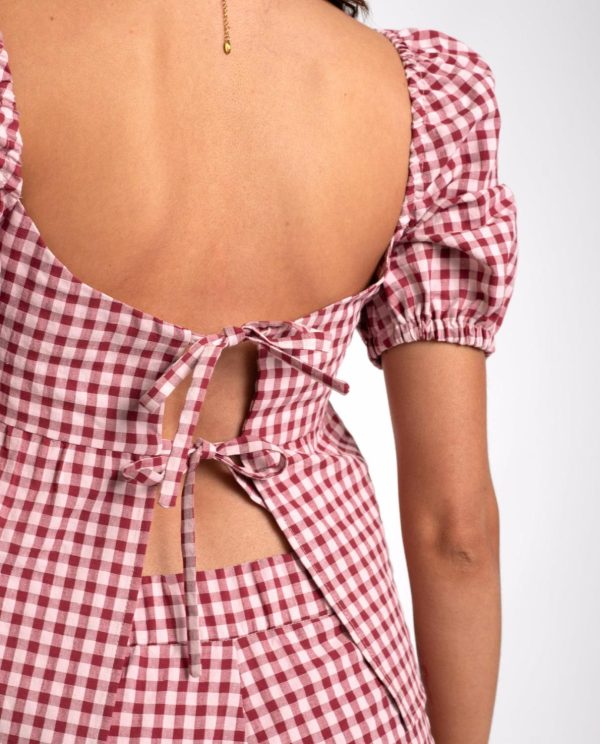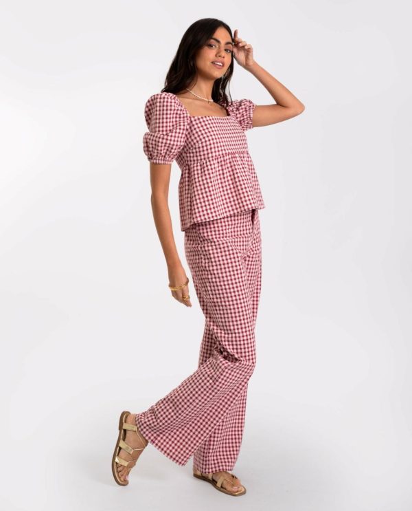 Flechazo a primera vista con este total look!? Inspirándonos en las últimas tendencias, hemos diseñado este conjunto de top y pantalón para acompañarte en todos tus planes de la temporada. Es cómodo, versátil y con él siempre irás perfecta. Se compone de una blusa con estampado vichy y mangas engomadas al hombro, y un pantalón de corte recto con talle alto. La blusa tiene el escote recto y un pequeño volante en el bajo, así que favorece muchísimo. Lleva el detalle de lazadas en la espalda como tanto os gusta!