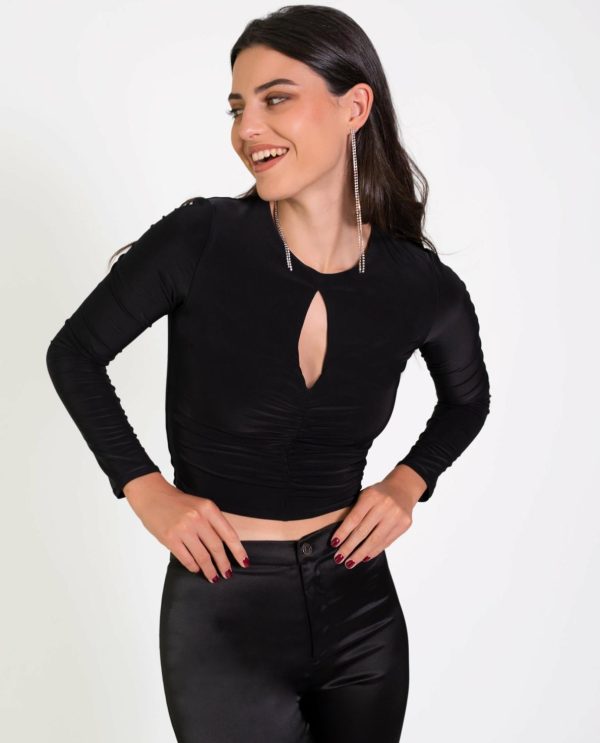 Lo mejor de una fiesta es que sabes cómo empieza, pero no cuándo termina. Para cualquier plan, este top de punto elástico es perfecto porque combina con absolutamente todo. Su diseño favorece muchísimo y estiliza la silueta: escote de lágrima, cuerpo ajustado y fruncido en el delantero con efecto óptico de cintura más estrecha. Combínalo con un pantalón negro ajustado para salir de fiesta y para diario, unos vaqueros mom fit y tus zapatillas… Con este top no necesitas nada más!