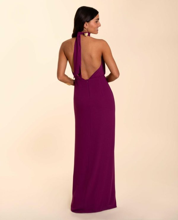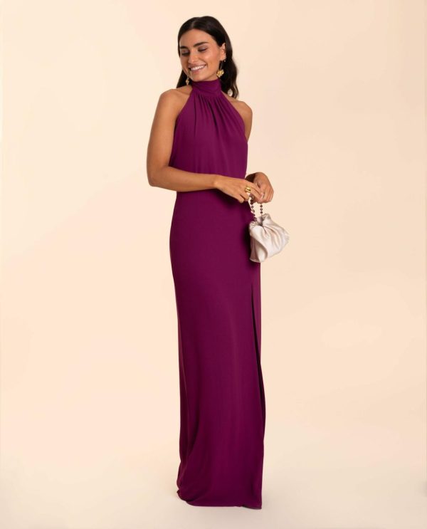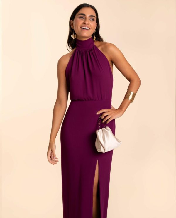 El vestido que buscas para convertirte en la invitada más elegante de tu próximo evento. Apostamos por este vestido de fiesta largo confeccionado en un tejido gasa ciruela, uno de los más acertados para vestir en todo tipo de celebraciones. El cuerpo tiene el escote halter y va sujeto al cuello con una lazada, dejando la espalda completamente descubierta. Su patrón no puede ser más favorecedor, ajustado a la cintura para marcar silueta y la abertura de la pierna al caminar es sencillamente espectacular. Combínalo con unos pendientes largos doraros, un clutch de mano y una de nuestras sandalias de fiesta para un total look de invitada perfecto.