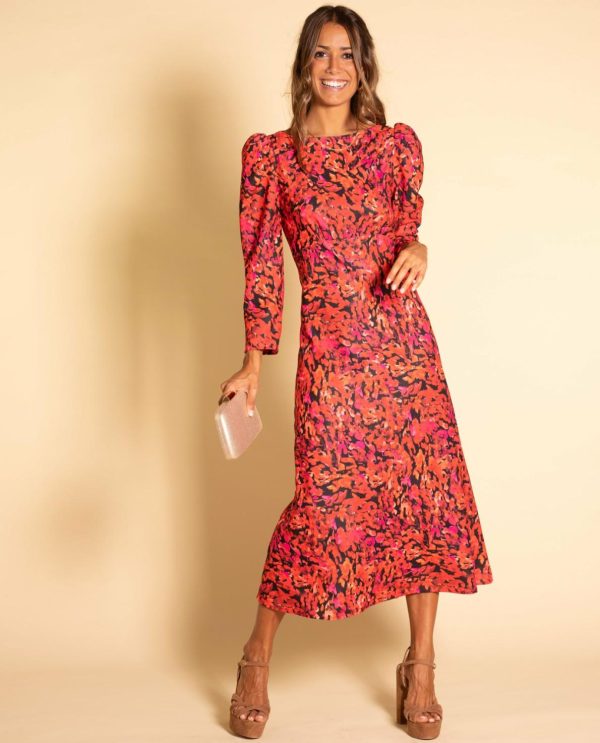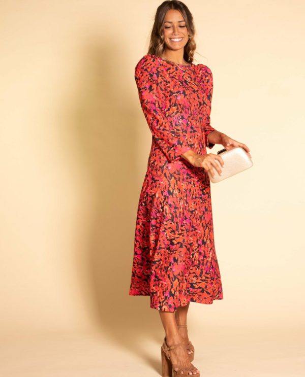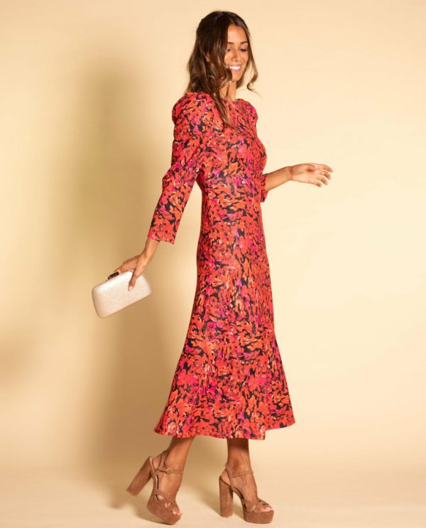 El estampado más especial de nuestra colección de eventos es este. Colores atrevidos como fresa, rojo y negro en forma abstracta sobre un tejido ligero con textura, este vestido ya se ha convertido en uno de los más buscado de invitada. Tiene el cuello cerrado, manga larga abullonada y es de corte evasé con vuelo, por lo que favorece a todo tipo de siluetas.
