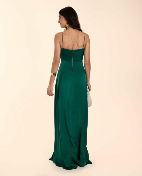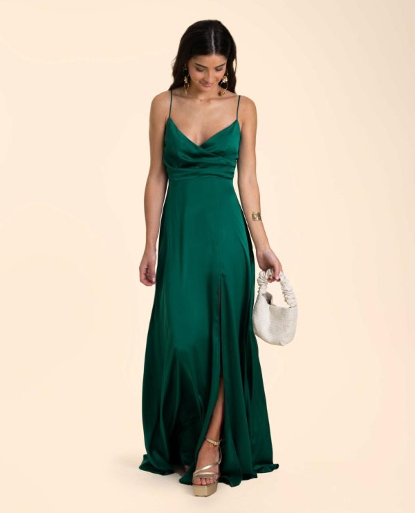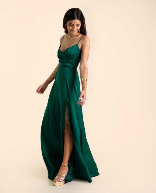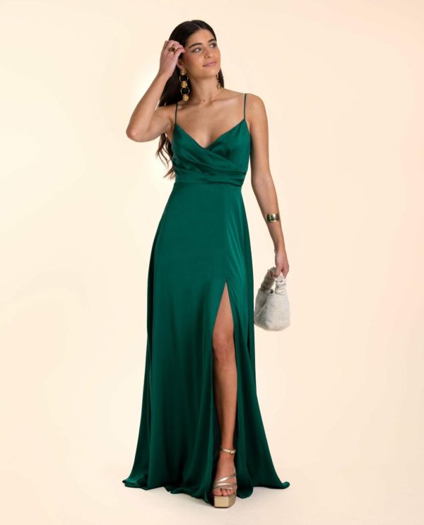 Si tienes un evento muy especial en el que buscas ir de largo, este vestido princesa es para ti. El diseño es muy especial, de tirantes con el escote cruzado para un efecto drapeado que favorece la silueta. El vestido destaca por su maxi falda con la abertura lateral, increíble lo bien que sienta. Está confeccionado en un tejido satén verde, el color para acertar 100% en eventos. Prueba a combinarlo con una de nuestras capas de invitada. Con este vestido no necesitarás más que unos pendientes largos y un bolso de mano.