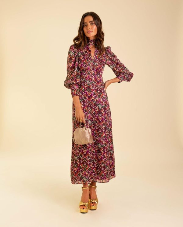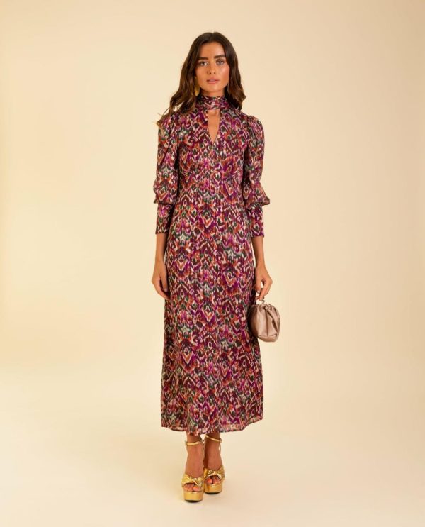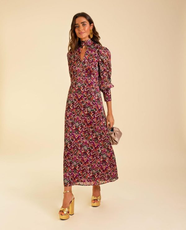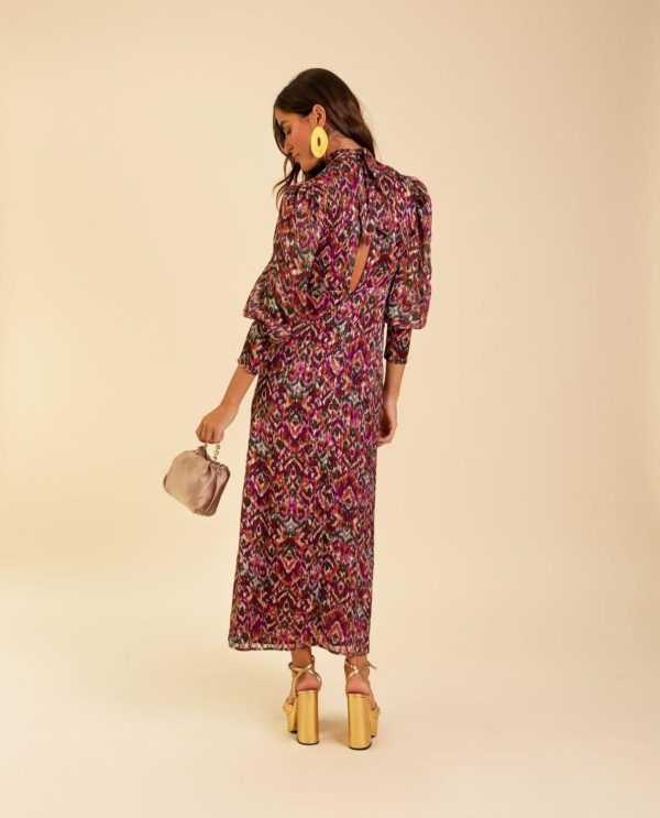 No necesitas nada más que este vestido para ir perfecta a ese evento que tanto tiempo llevas esperando. Este es un vestido único con un estampado 100% diseñado por nosotras. Está confeccionado en un tejido gasa súper elegante con mucha caída y con un print que combina los tonos burdeos, naranja y beige. Como detalle, le hemos añadido un hilo de brillo que aporta mucha luz al look. El cuello alto con escote de lágrima se combina con una abertura elegante en la espalda y sus mangas abullonadas estilizan muchísimo. Nos encanta cómo queda con complementos en dorado. Elige este vestido para acompañarte en tu próximo evento antes de que se agote.??