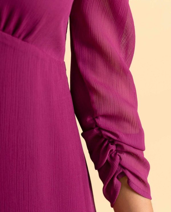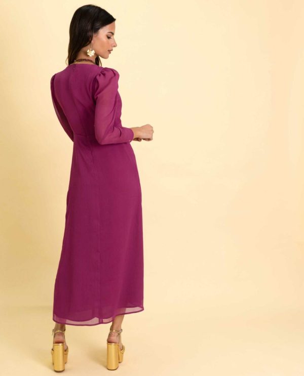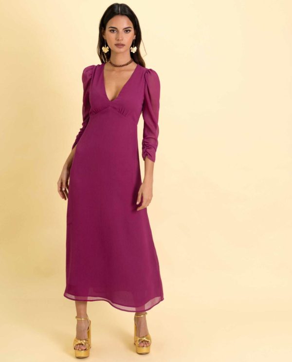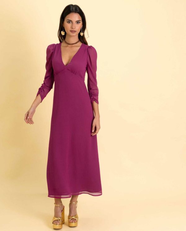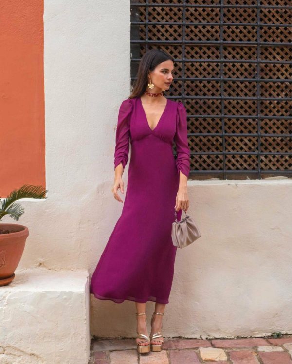 Los detalles son clave para vestir en un evento y si eres de las que defienden el ‘menos es más’ este vestido midi de invitadas es para ti. Con este diseño no vas a pasar desapercibida, su escote en pico pronunciado asienta perfecto y estiliza muchísimo gracias a su fruncido debajo del pecho, lo llevarás muy cómodo! Está confeccionado en un tejido gasa fluido en un color buganvilla súper favorecedor y las mangas abullonadas semi transparentes. Sus detalles lo convierten en uno de los diseños más originales para lucir en tu próximo evento, apuesta por él!✨