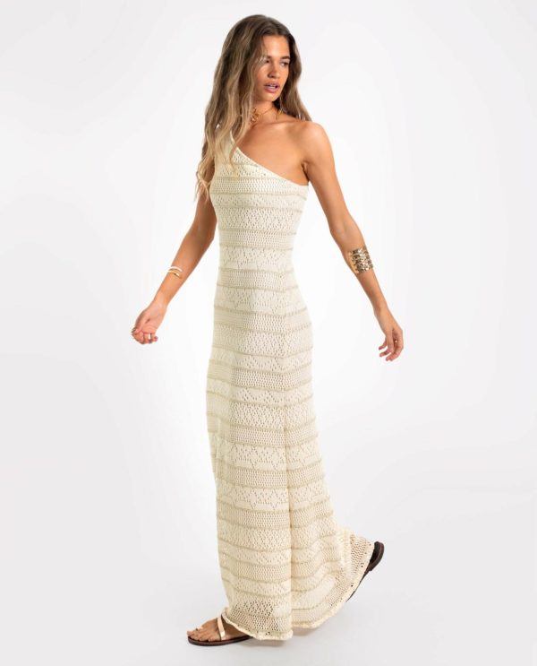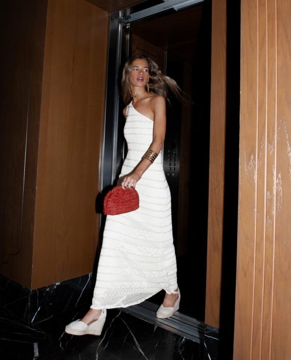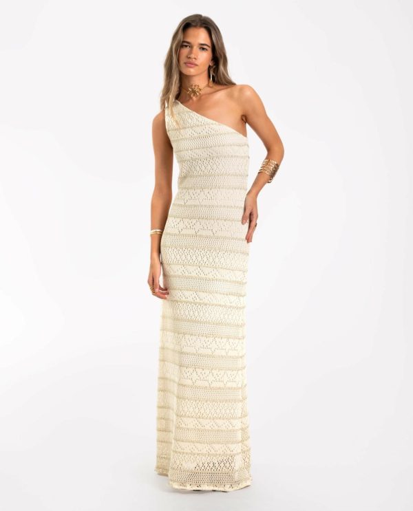 Diseñado para que siempre que lo lleves seas la mejor vestida, ya sea para salir de fiesta o quedar con amigas. Lo más especial de este vestido es su tejido de punto crochet que alterna distintos motivos y tipos de hilo, punto y lurex dorado que aporta ese brillo que es tendencia. Tiene el escote asimétrico y el bajo evasé, por lo que tiene mucho movimiento. Nos encanta cómo queda con accesorios dorados!
